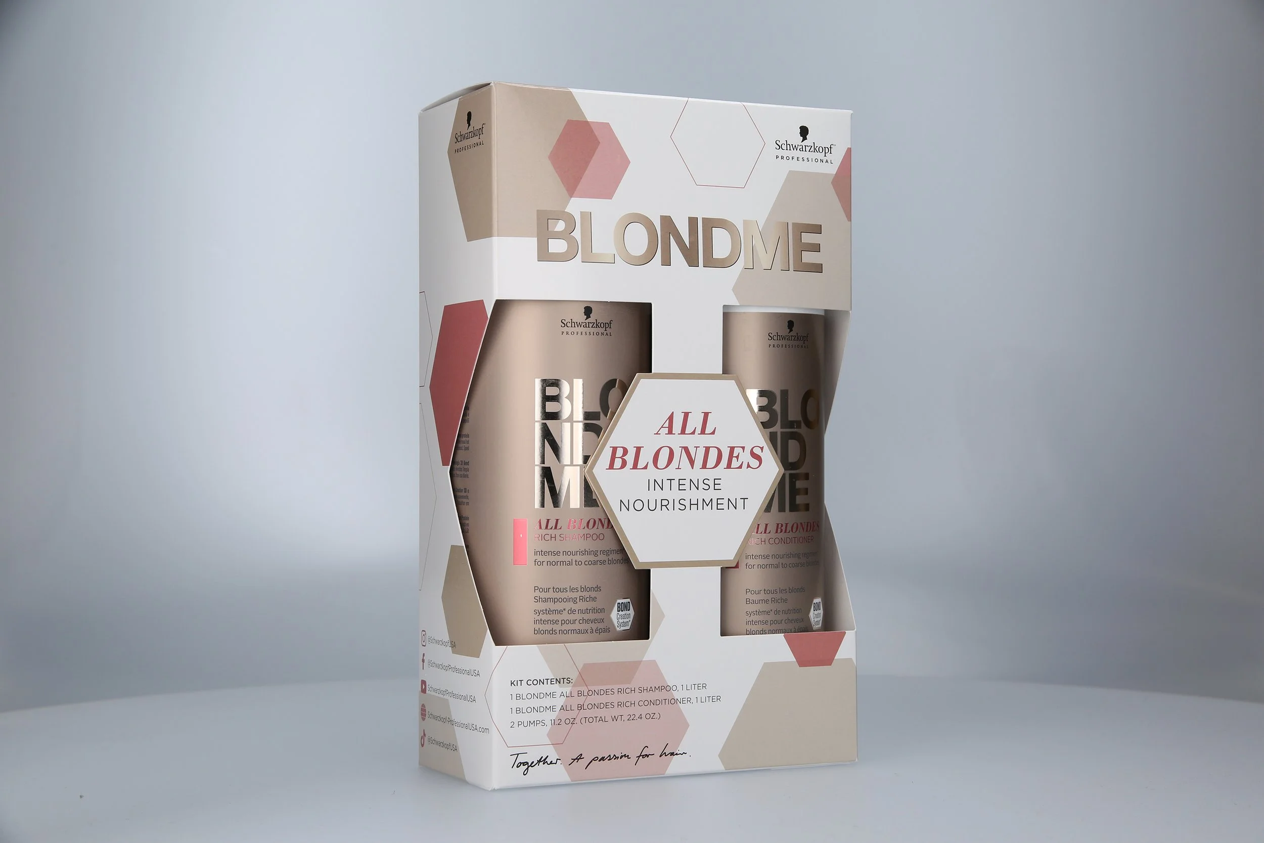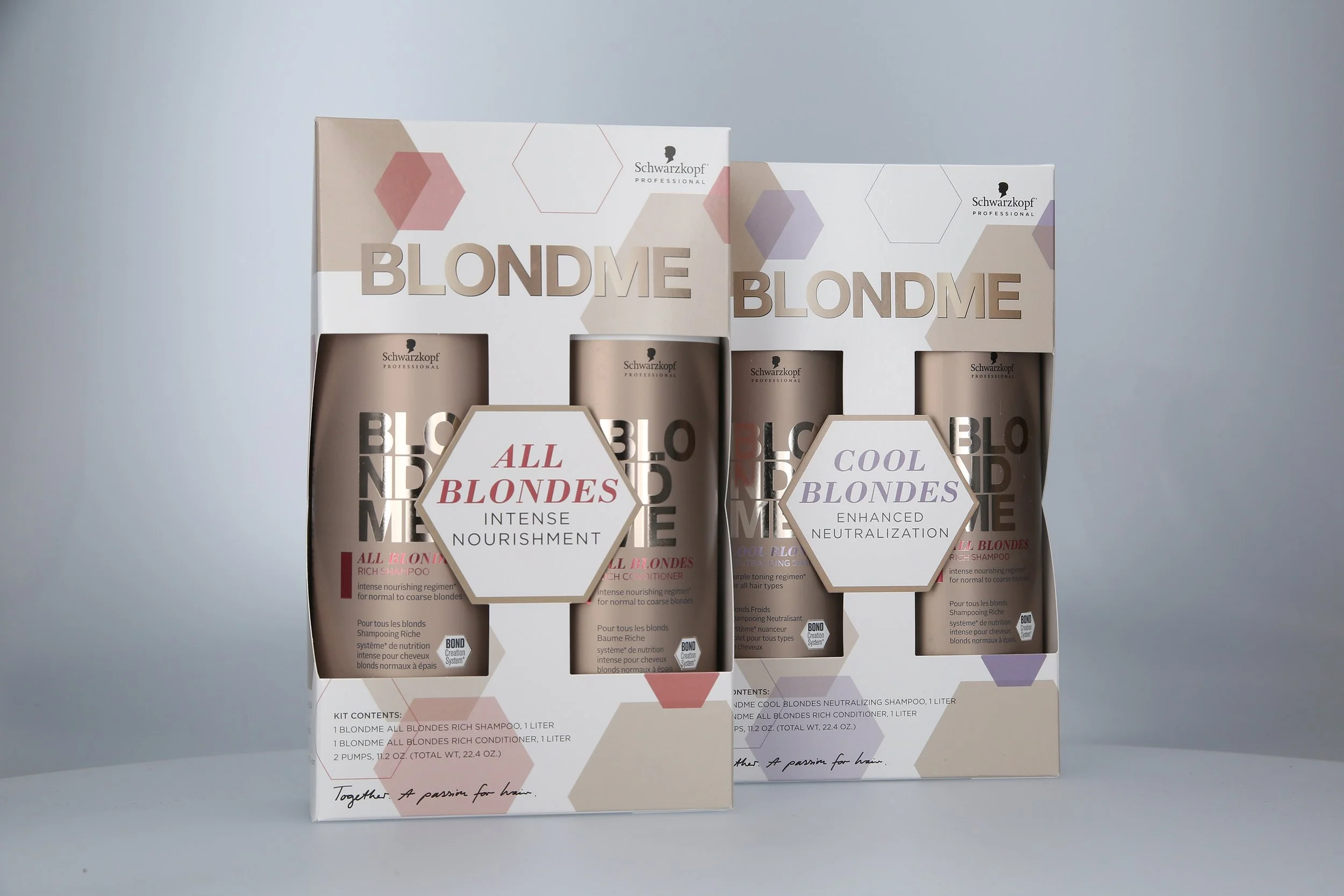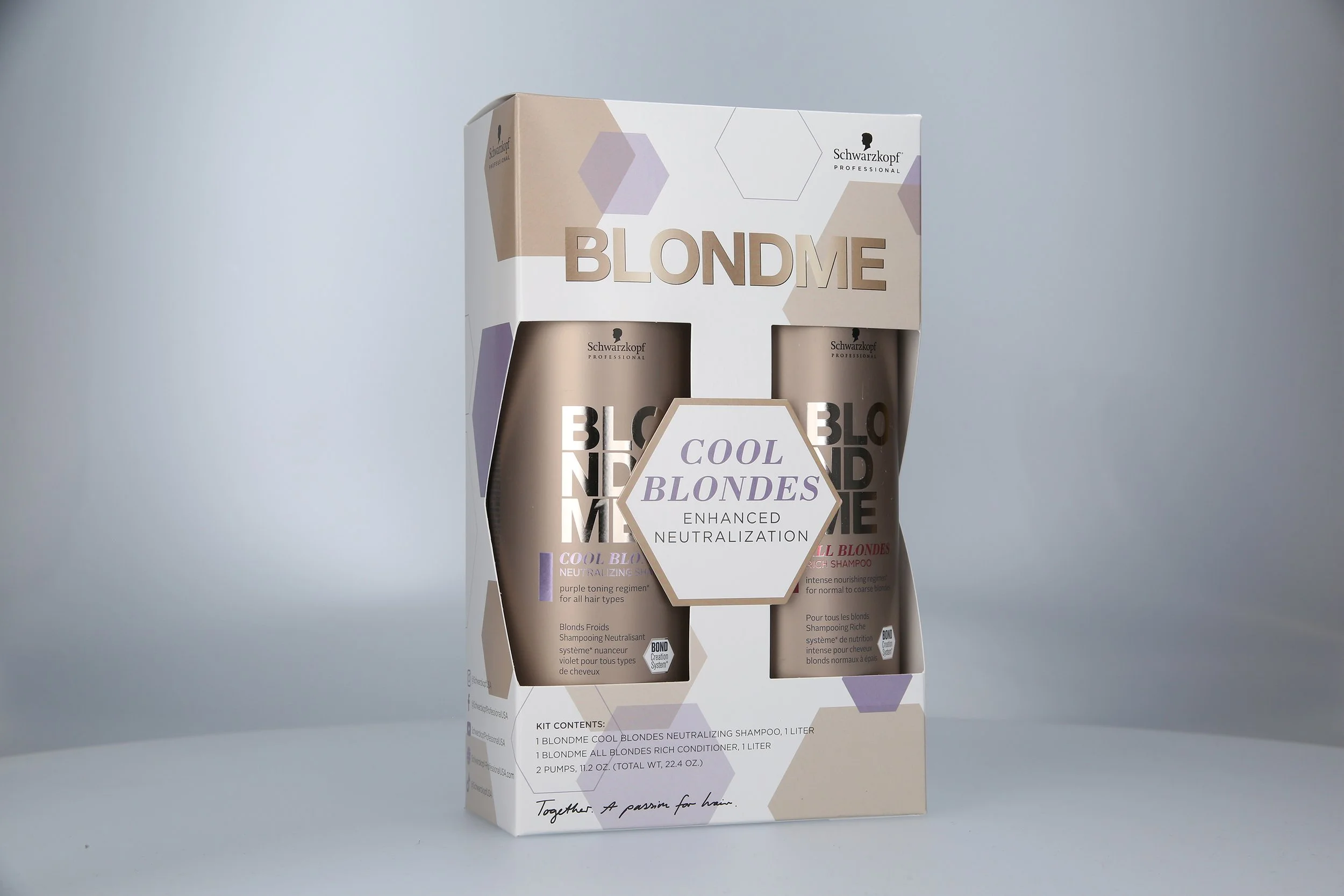 Two kit boxes for two variations of Schwarzkopf Professional BLONDME brand shampoo and conditioner liter duos.